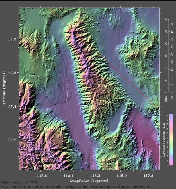 Satellite Color Relief Image of the Inyo & White Mtns, the Sierra Nevada Range, and the Owens Valley in California
